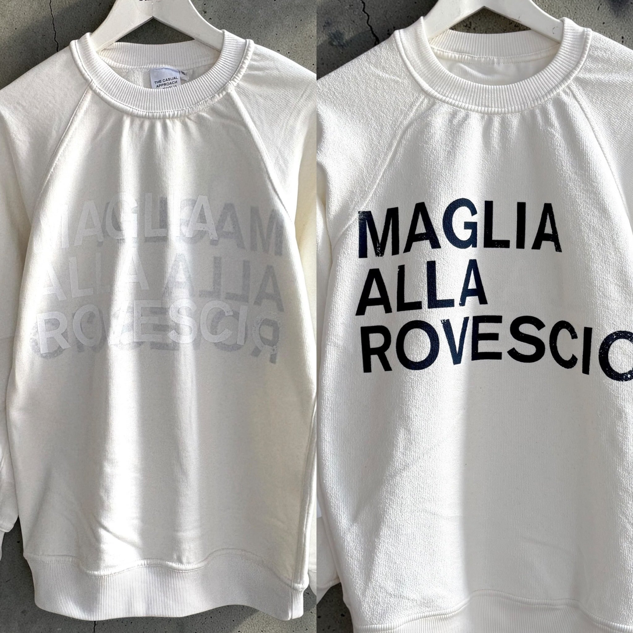 定番リバーシブルスエットの復刻バージョン。初期モデルのベストセラーROVESCIOは表側に白プリント、裏側にネイビープリント施しリバーシブルスウェットに落とし込みをした人気モデルとなっております。
